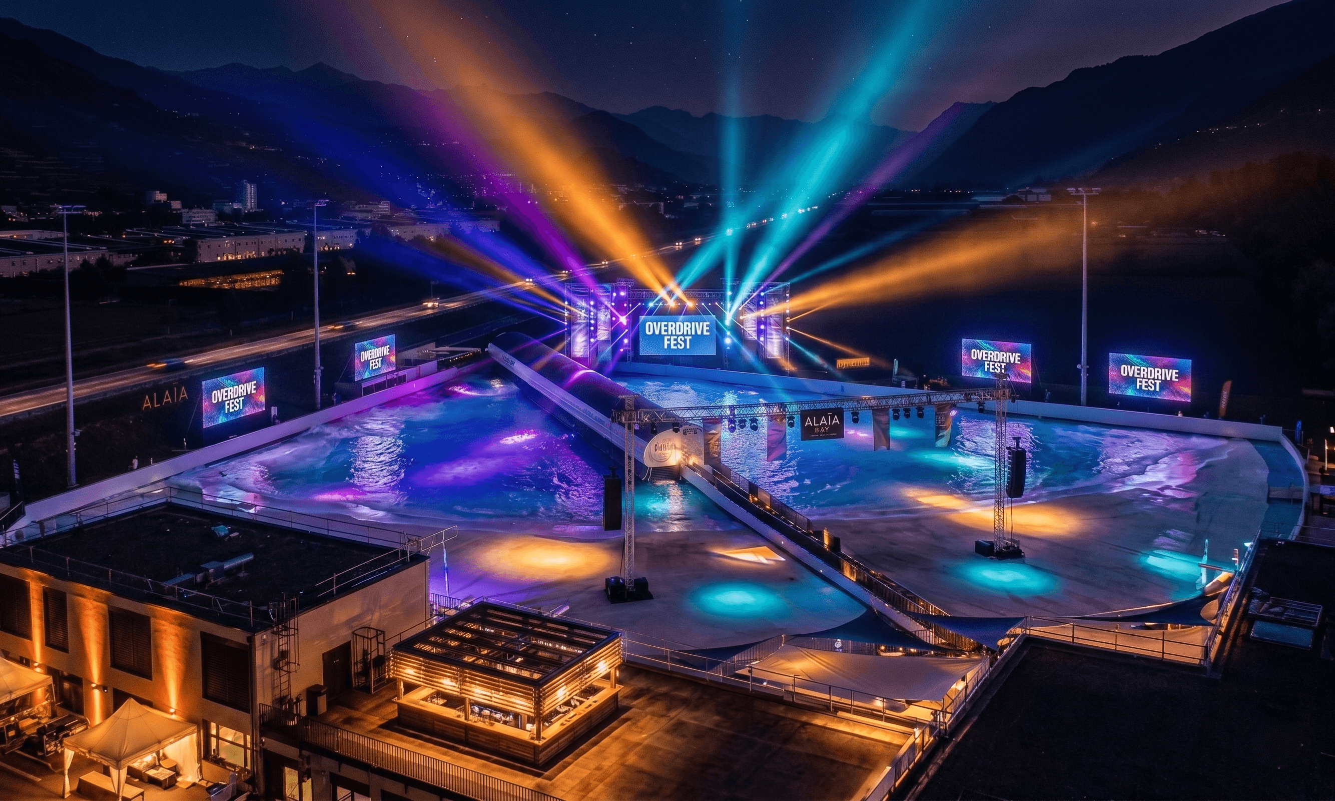 Imaginez un spot de surf artificiel au pied des Alpes valaisannes, entouré de montagnes, à 10 minutes de l'autoroute. C'est Alaïa Bay, et c'est là qu'OVERDRIVE prend vie.